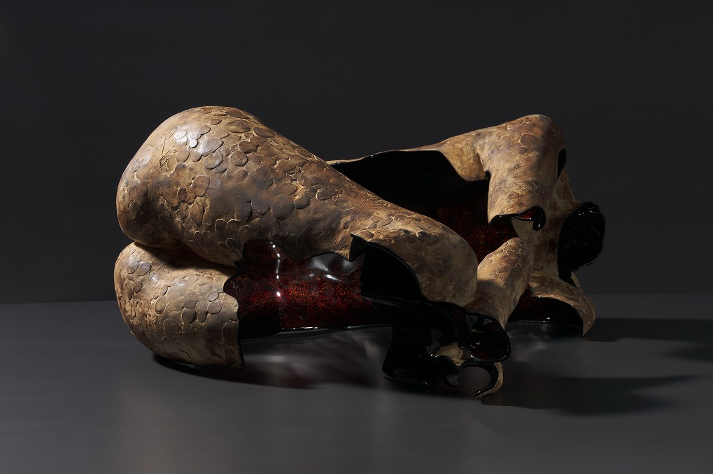 漆を使った伝統的な彫刻技法で制作する方です。人間の背中に注目するという着眼点も面白く、さらに内側は装飾的に仕上げて外側の印象と対比させる手法も見事です。ブロンズなどの他の素材に比べて漆は軽いので、展示の自由度も高いのが魅力です。春慶(漆器)の伝統を持つ伊勢の風土と、うまくマッチすると思います。