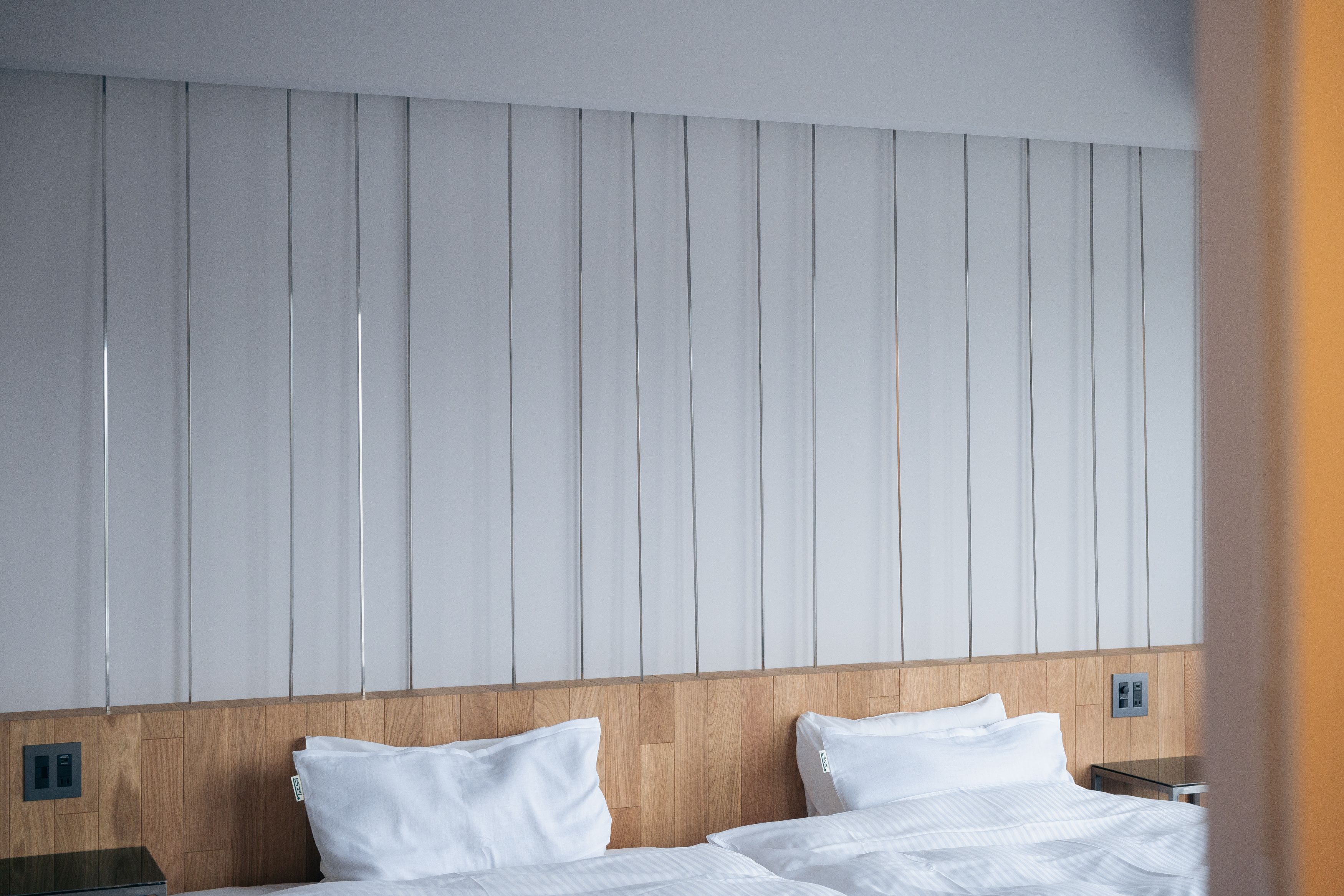 伊勢宮町ホテルの各客室は、冬至の日に差し込む太陽の光と影をもとにデザインされています。白い椅子に映し出された一日の光の移ろいを、部屋ごとのコンセプトカラーとして丁寧に投影しました。